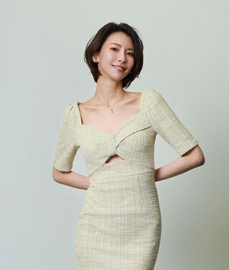 韓国製 | rinfarre | グリーン ライトツイード 胸元リボン 五分袖 タイト ミディアムドレス ワンピース