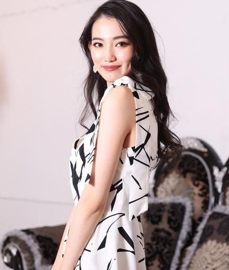 韓国製 | rinfarre | ホワイト×ブラック 肩リボン ノースリーブ Vネック アシメントリー Aライン フレア ミディアムドレス
