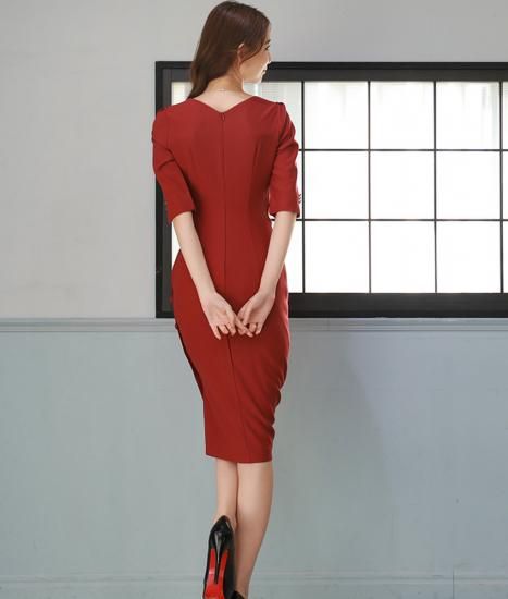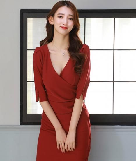 韓国製 | rinfarre | 五分袖 飾りくるみボタン サイドスリット Vネック タイト ミディアムドレス ワンピース