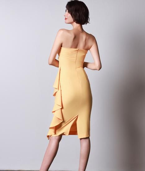 韓国製 | rinfarre | ベア イエロー 胸元ハートカット サイドフリル セクシー タイト ミディアムドレス 膝丈 ワンピース