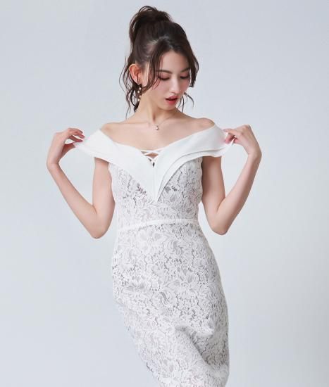 韓国製 | rinfarre | オフショルダー 総レース ホワイト 胸元編みデザイン フリル キュート タイト ミディアムドレス ワンピース