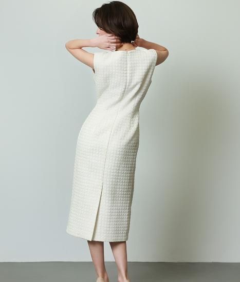 韓国製 | rinfarre | ツイード ウエストタック ホワイト ラメ糸 ノースリーブ 大人シルエット タイト ミディアムドレス ワンピース