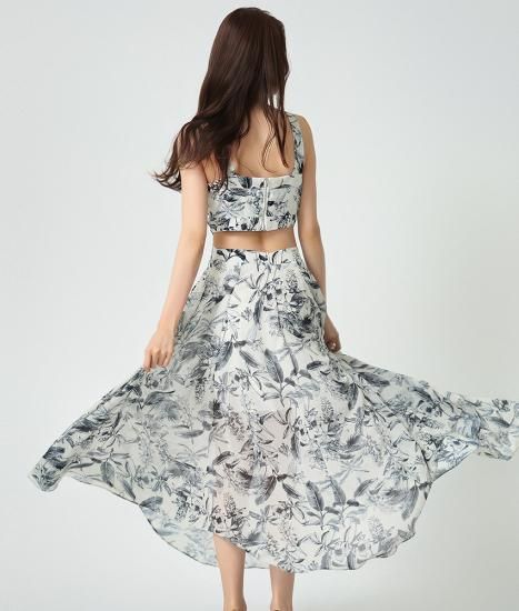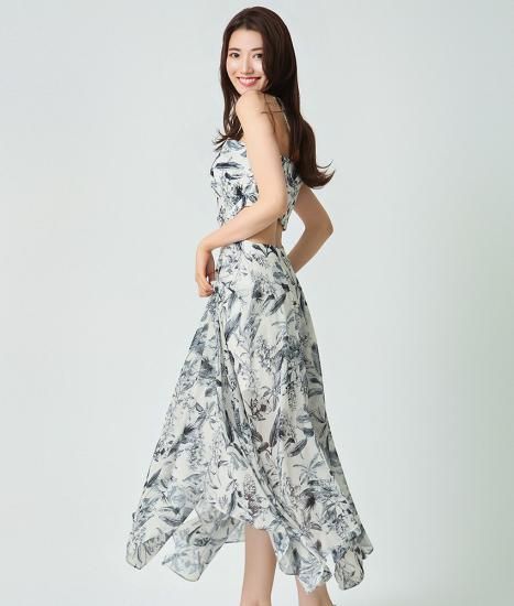 韓国製 | rinfarre | ボタニカル柄 アイボリー Vネック ホルターネック シフォン ヘムデザイン ノースリーブ ロングドレス ワンピース