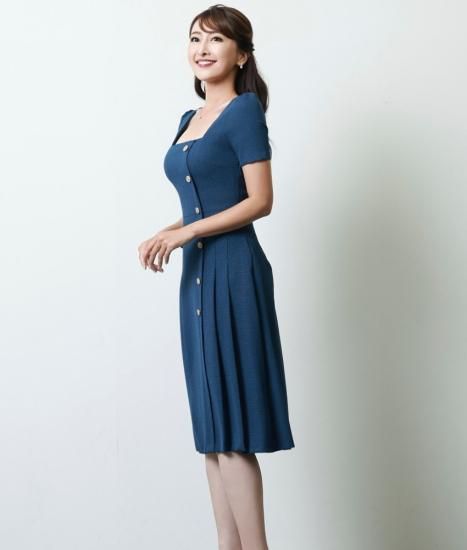 韓国製 | rinfarre | 半袖 ネイビー 金ボタン スクエアネック プリーツ ポケット ラメ Aライン ミディアムドレス ワンピース