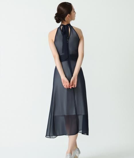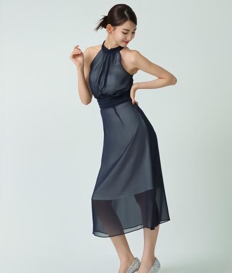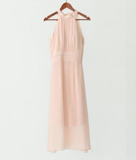 韓国製 | rinfarre | ホルターネック シースルー Aライン プリーツ シフォン ノースリーブ ミディアム ひざ下 ワンピース ドレス