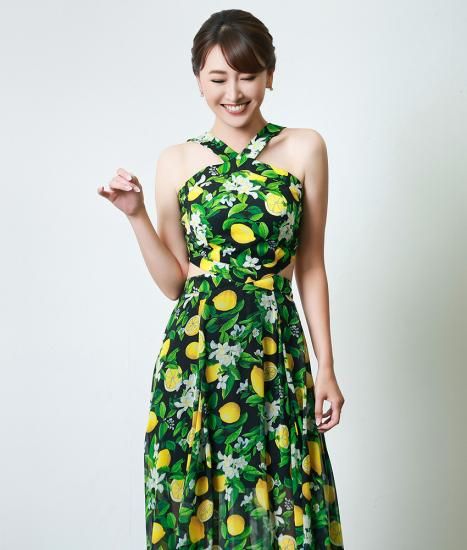 韓国製 | rinfarre | レモン柄 プリント Vネック ホルターネック シフォン ヘムデザイン ノースリーブ ロングドレス ワンピース