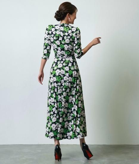 韓国製 | rinfarre | 花柄 エレガント ブラック Vネック カシュクール 七分袖 マキシ ロングドレス ラップ ワンピース
