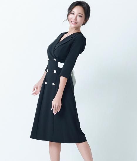 | おススメポイント | ・・rinfarre リンファーレコレクション・・ 襟付きのVネックデザインが顔まわりをすっきり見せ、七分袖で上品な印象に♪ Aラインシルエットがスタイルを美しく引き立て、動くたびに女性らしさを演出します。 背中のリボンとフロントボタンがクラシカルなアクセントになったミディアムドレスです。 お仕事用はもちろんパーティーなどにもおすすめ! ※韓国製の人気ワンピースです。