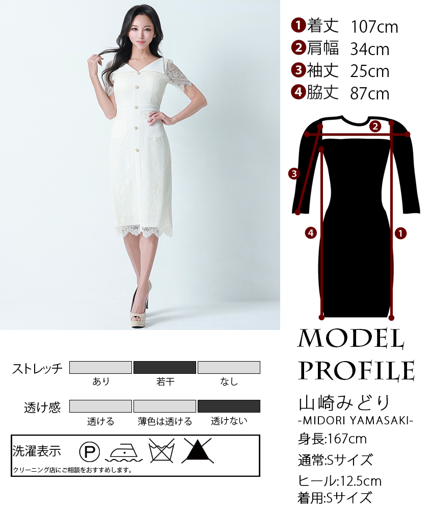 | おススメポイント | ・・rinfarre リンファーレコレクション・・ タイトラインのミディアムドレス。 フロントボタンが映える、シンプルで洗練された一着。 上品なレース素材を贅沢に使用し、着るだけで洗練された印象に◎ お仕事用や普段のお出かけ、お食事にもおすすめです! ※韓国製の人気ワンピースです。