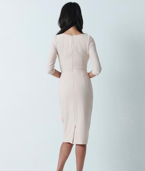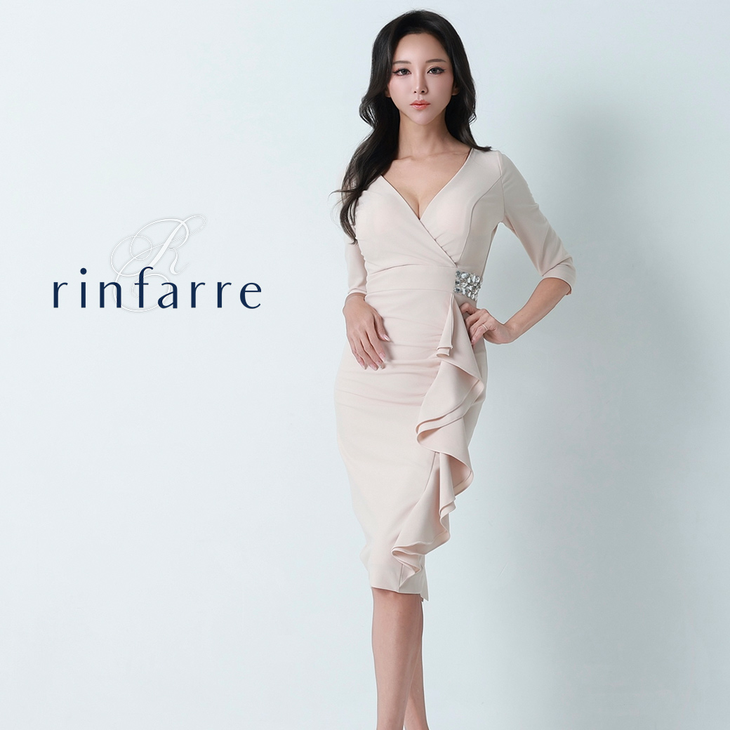 韓国製 | rinfarre | ベージュ ビジュー 七分袖 フリル Vネック タイト ミディアムドレス ワンピース myju