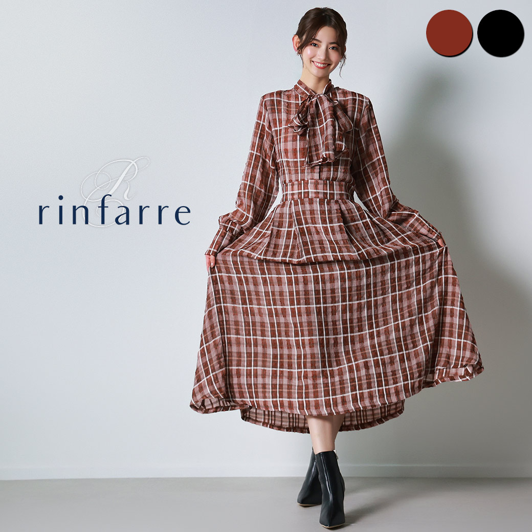 韓国製 | rinfarre | チェック柄 長袖 リボンタイ Aライン ブラウン ブラック フレア ロング ひざ下 ワンピース ドレス