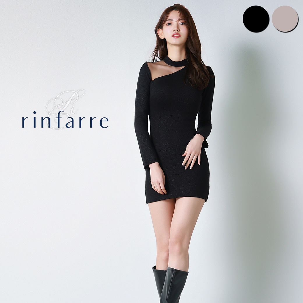 韓国製 | rinfarre | 長袖 ミニ ラメ生地 シアー切替 タイト ブラック ブラウン ストレッチ ミニドレス ワンピース