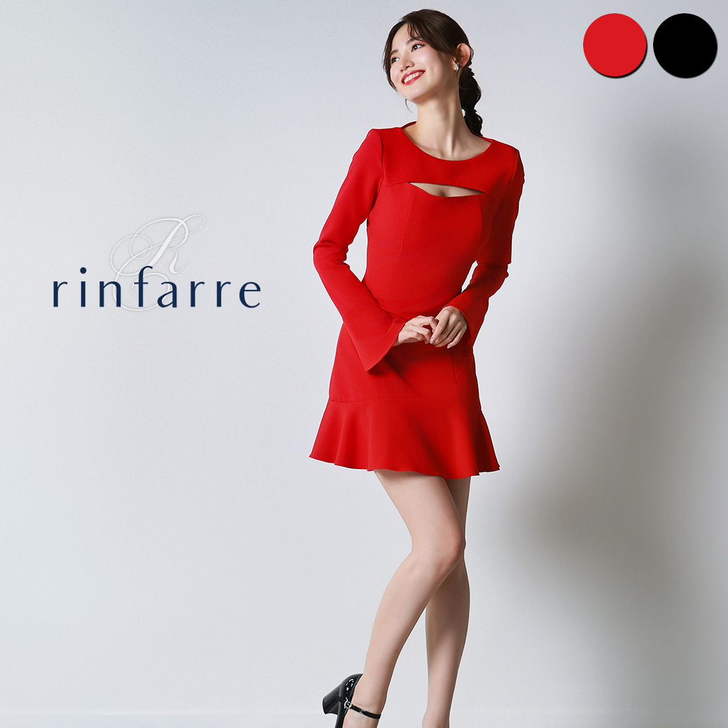 韓国製 | rinfarre | レッド ブラック ミニ 長袖 フレアスリーブ 胸元カット フレア Aライン ミニドレス ワンピース