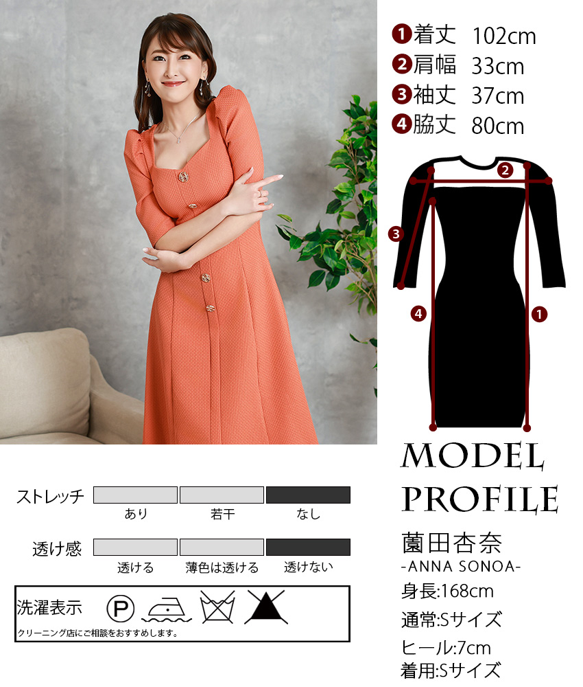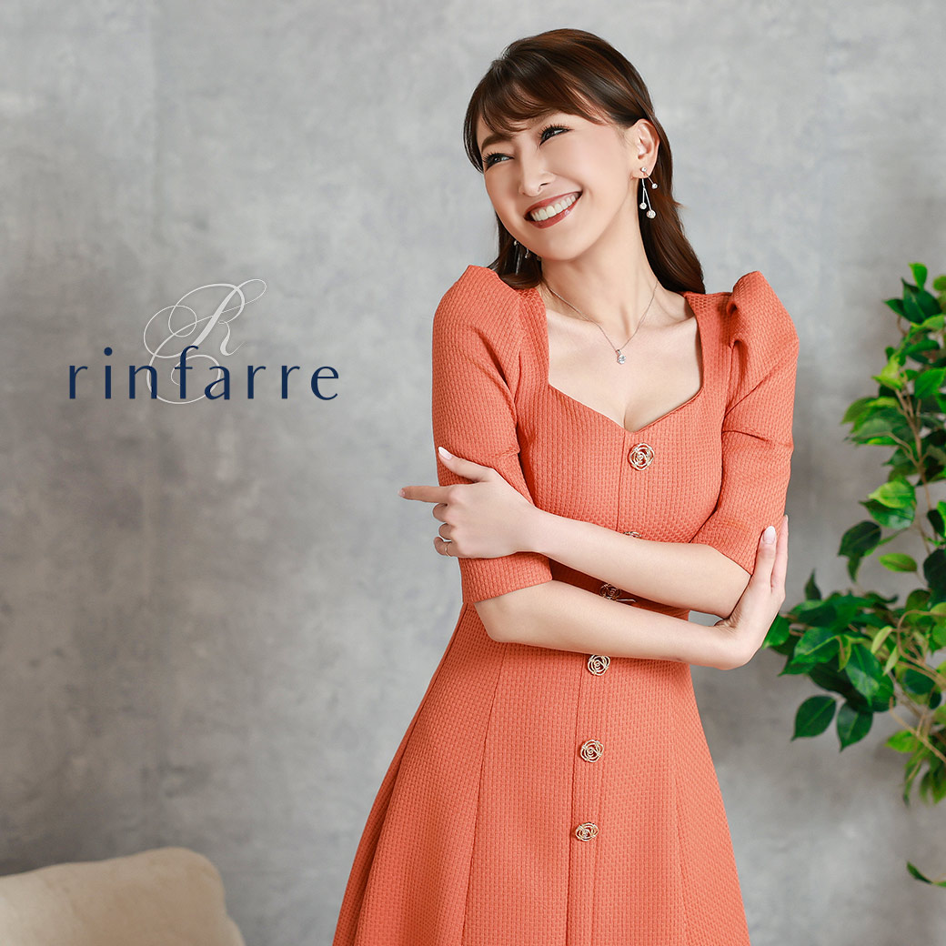 韓国製 S M Lサイズ / 1カラー | rinfarre | オレンジ ボタン ベルト 五分袖 パフスリーブ Aライン ミディアムドレス ワンピース