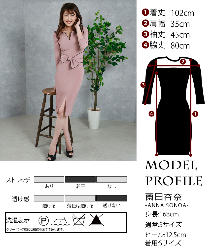 韓国製 | rinfarre | ピンク 七分袖 胸元カット ウエストリボン タイト ミディアムドレス ワンピース